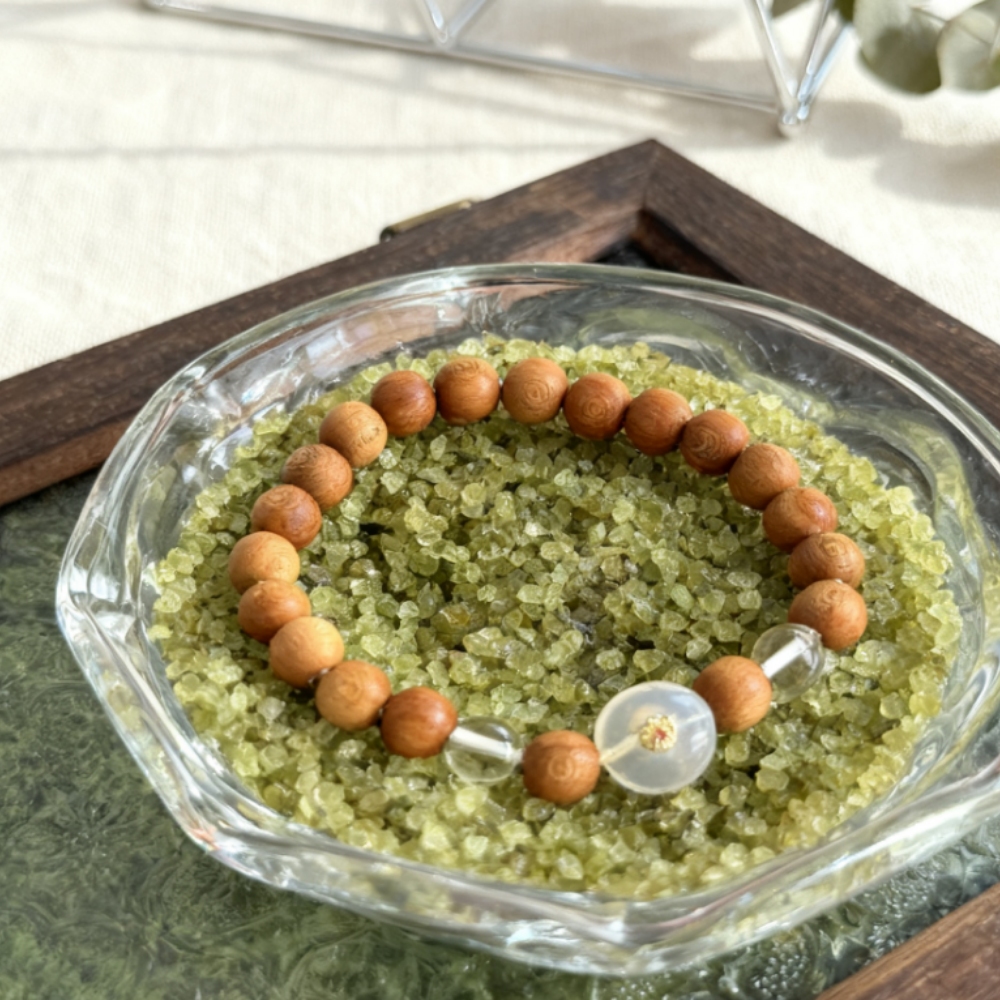 Light wooden beads combined with golden accents evoke the first rays of sunlight at dawn, bringing warmth and tranquility to the wearer.